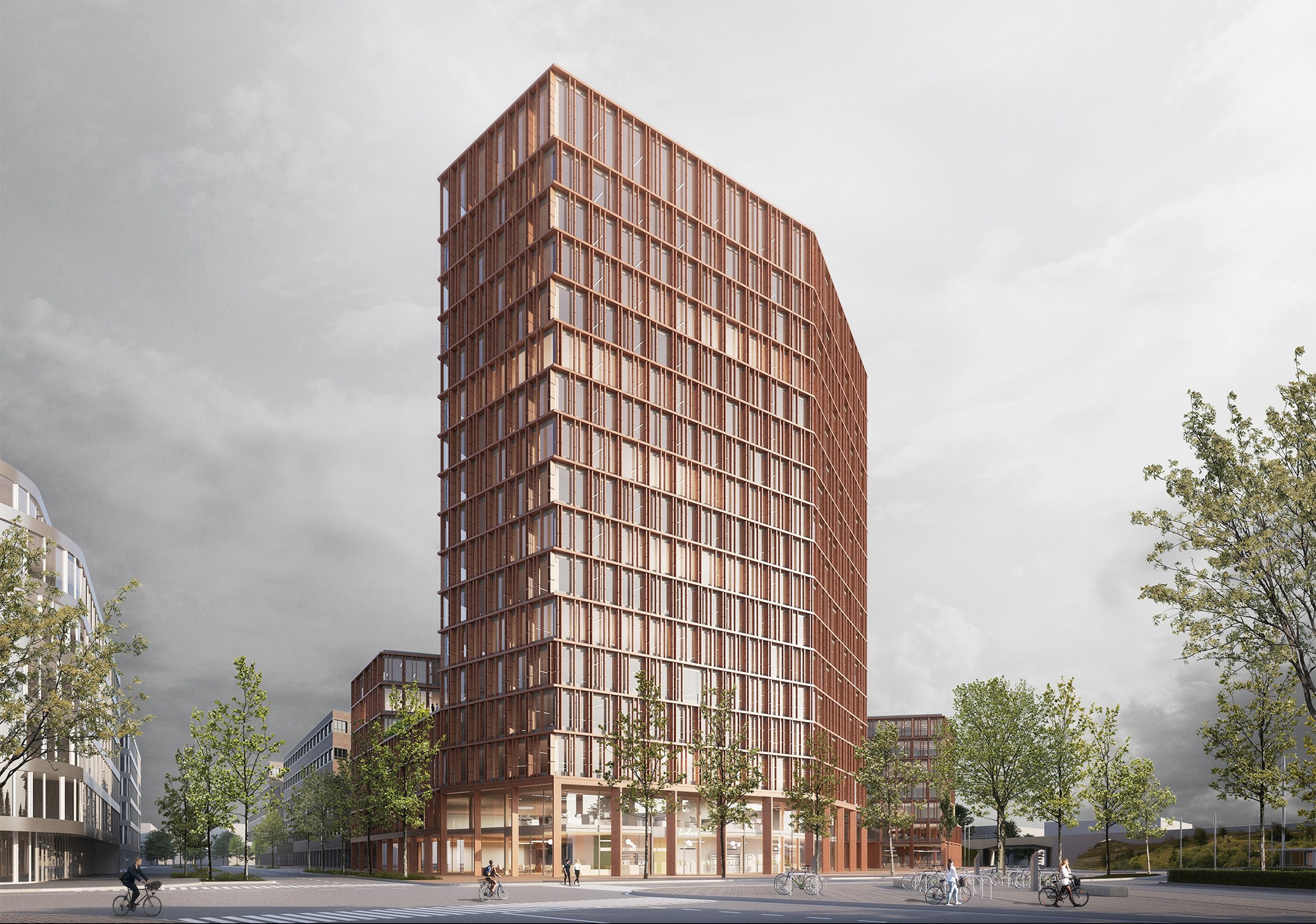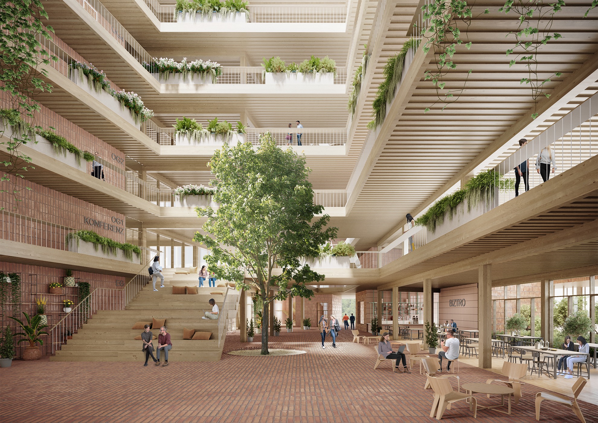 Eine Besonderheit des Projekts ist die konsequente Umsetzung einer Holz-Hybrid-Bauweise. Während die Untergeschosse und Erschließungskerne in massiver Stahlbetonbauweise ausgeführt werden, kommen in den Regelgeschossen großformatige Holzbauelemente zum Einsatz. Diese Kombination ermöglicht eine deutliche Reduzierung der CO₂-Emissionen bei gleichzeitiger Sicherstellung hoher Tragfähigkeit und Flexibilität der Baukörper.